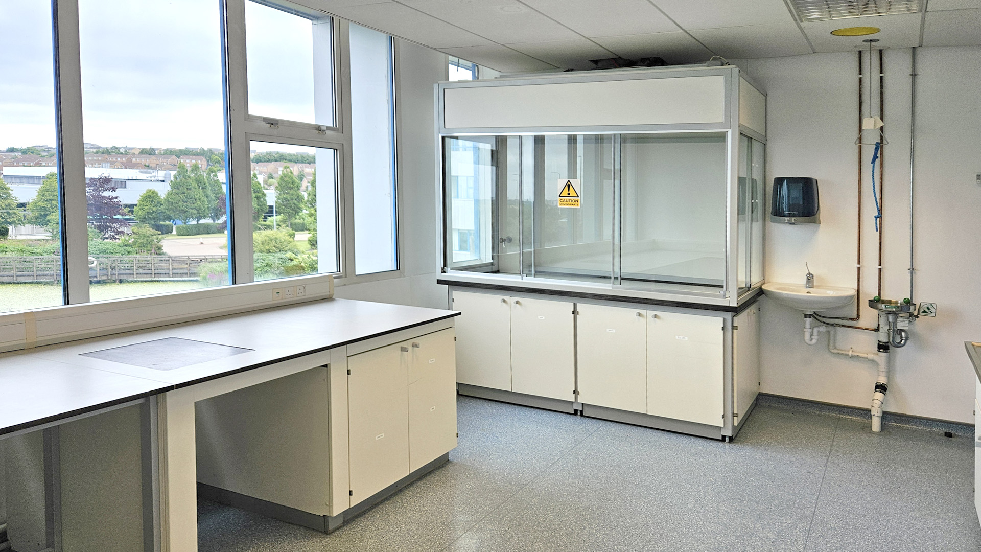 The lab features benching, a lab sink, a hand wash sink with hot and cold water supply, lab vinyl flooring, and storage cupboards under the bench.
